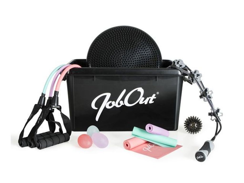 JobOut Box, ett hälsofrämjande startpaket med enkla redskap och övningsinstruktioner till hela avdelningen för att skapa en hälsosammare och friskare arbetsplats. I paketet ingår tre gummiband, tre stretchband, tre handträningsbollar, en balanskudde, en massageslinga och en massageboll. Produkterna är av hög kvalité för att ge bästa resultat och för att förebygga de vanligaste förslitningsskadorna på företag. Ladda ner JobOuts app för att se videoinstruktioner, ställa in påminnelsefunktioner och följa din JobOut resa. Utvecklat i nära samarbete med legitimerade sjukgymnaster, massageterapeuter, ergonomer och personliga tränare.