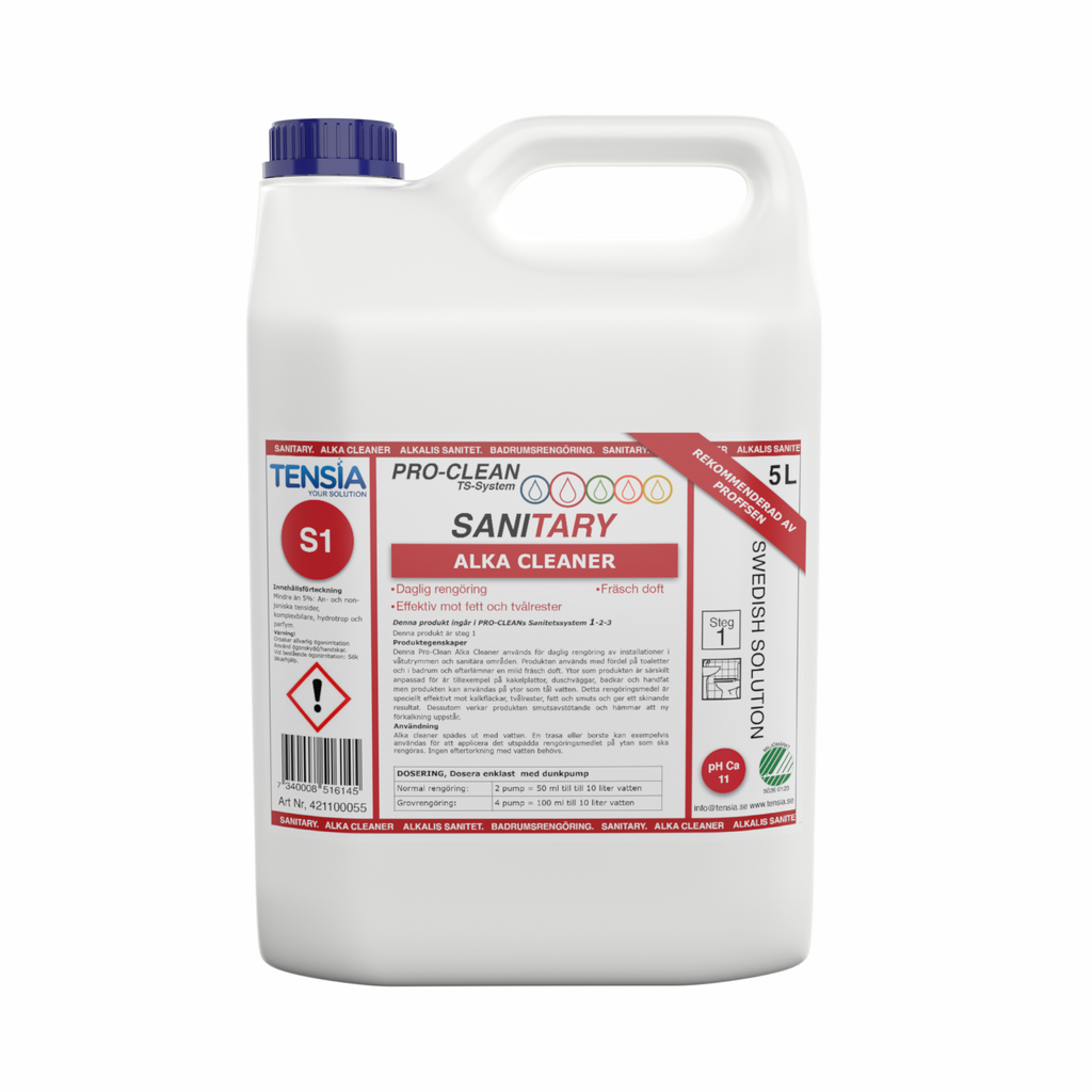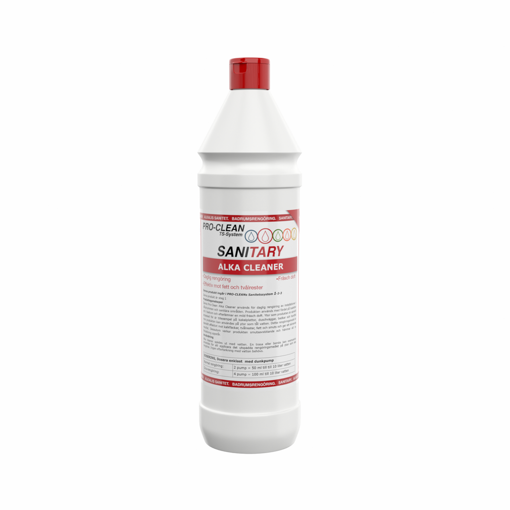 Pro-Cleans Alka Cleaner används för daglig rengöring av sanitära utrymmen och våtrum. Den är särskilt effektiv mot fett samt tvålrester och efterlämnar en fräsch doft. Produkten används med fördel till rengöring av kakelplattor, duschväggar, toalettstolar men kan användas på alla ytor som tål vatten. Alka Cleaner verkar smutsavstötande och hämmar att ny förkalkning uppstår.