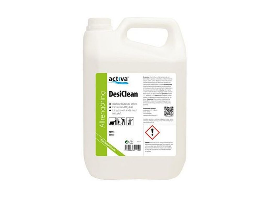 Desinficerande allrengöring med långtidseffekt och frisk doft. Fungerar både inom- och utomhus. Idealisk för omklädningsrum, badrum, toaletter, våtutrymmen, fasader, staket, tak etc. Avlägsnar missfärgning/beläggningar av mögel, alger, mossa, lav, fett, sot, olja m.m. Efterlämnar ett skydd på ytan som gör att bakterietillväxten hämmas för lång tid framåt. Bruksanvisning: Activa DesiClean kan användas dagligen på normalt smutsade ytor och efterlämnar inte ränder eller kemrester. Blanda enligt dosering och bearbeta ytan maskinellt eller för hand. - Hämmar bakterietillväxt - Eliminerar dålig lukt - pH-värde: 11,5 - Lukt: Parfymerad - Utseende: Grön vätska