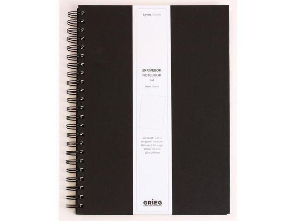 Beskrivning av Ant.bok GRIEG Design A4 100g linj svart Elegant anteckningsbok Grieg Design.Spiralbunden med hårt omslag i linnetextil. A4, 100g, 80 blad, linjerad, svart