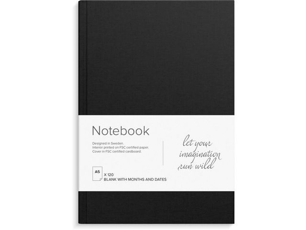 Anteckningsbok i A5 format med olinjerade blad och omslag av linnetextil. Elegant inbunden anteckningsbok i linnetextil. Med ett datumfält längst upp på varje sida för att enkelt kunna hålla ordning på anteckningarna. - A5-format - Pappersvikt: 90g - 120 blad - Olinjerad - Färg omslag: Svart - Hårt omslag - Färg papper: Vitt - FSC-papper