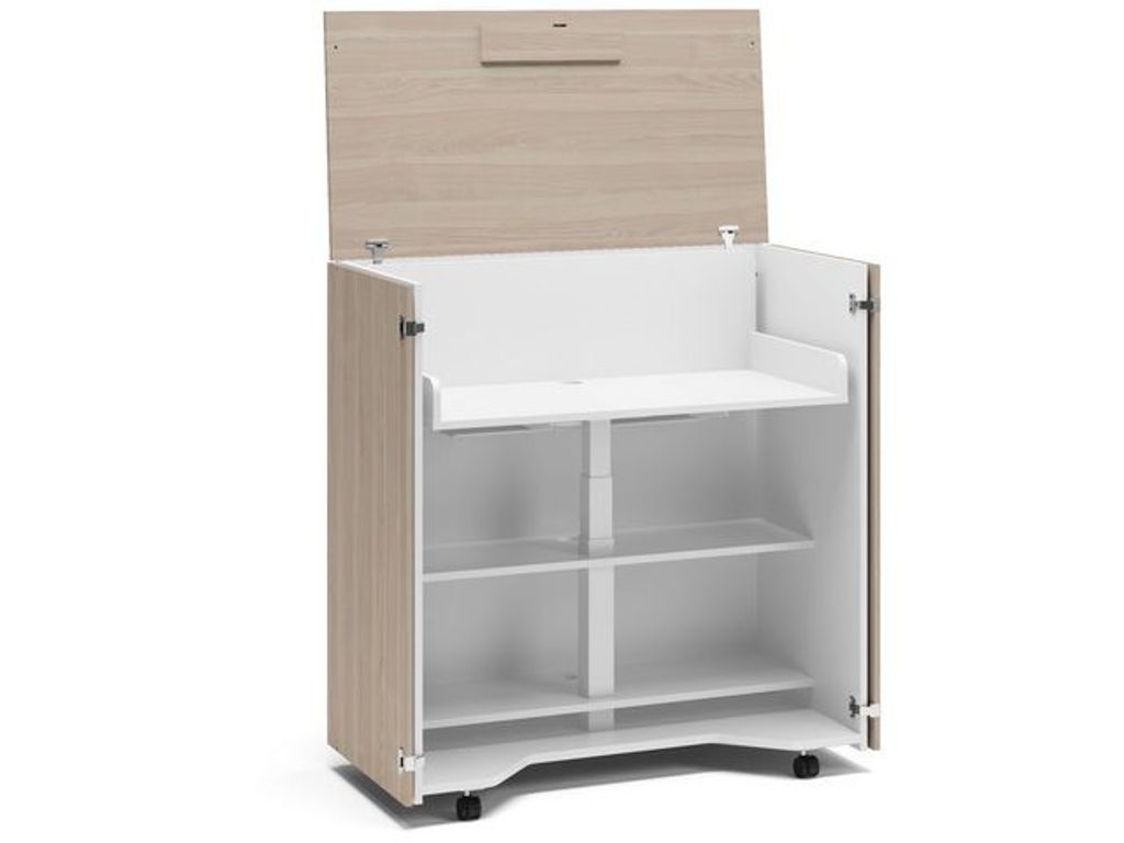 Cubic är en snygg och funktionell kontorsmöbel både för kontoret och hemmet. På endast 19 sekunder förvandlas Cubic till en komplett ergonomisk arbetsplats, stilren möbel på en kubik. Cubic erbjuder rätt ergonomi med ett höj- och sänkbart arbetsbord komplett med laddstation, plats för förvaring och lätt att flytta. Kabelgenomföring samt kabelränna ingår i standardutförande. Flera tillbehör finns att köpa till Cubic tex funktionslist, monitorfäste, LED lampa, pennkopp, systemhylla, grenuttag, Q1 laddare, lås till dörrarna, balanspallen Point samt underarmstöd. Vitlaminat stomme / front och lock i vitlaserad asklaminat. - Material: Vitlaminat stomme / front och lock i vitlaserad asklaminat. - Mått (HxBxD): 1310x1230x630 mm - Arbetsyta 1060*520 mm - Höjdjustering 670-1230 mm - Slaglängd 560 mm - Svängradie dörr 600 mm - Lyftkraft 80 kg