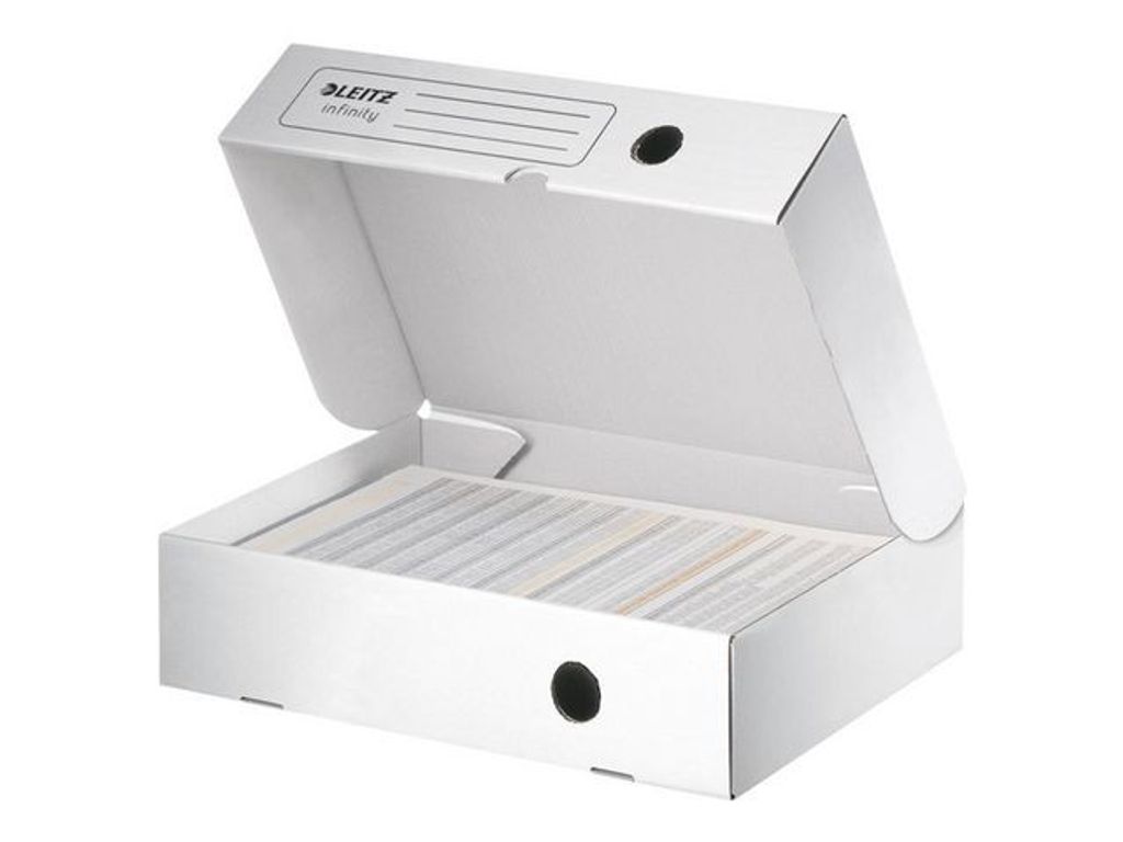 Härifrån till evigheten - Leitz Infinity arkiveringsbox Leitz Infinity, serien för långtidsarkivering, uppfyller den internationella ISO 16245 standarden för långtidsarkiveringFSC certifierade och är tillverkad av korrugerad kartong som är syrafri och av 100% jungfrufiber och rekommenderas till arkiveringsspecialister som nationella arkiv, museum, bibliotek, kyrkor, skolor och privata organisationerDenna 80mm breda box har en design som gör den enkel att montera vilket spar tid och kraft.Dubbla förslutningsklaffar ger ett bra skydd åt innehållet och förstärker tumhålet vilket förhindrar oavsiktlig öppning.Idealisk till förvaring av A4 dokument och papper.Kan förvaras stående eller liggande.