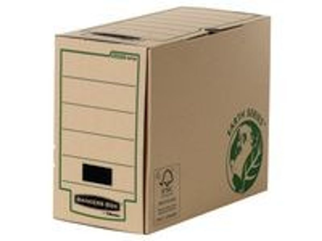 Arkivlåda för förvaring av dokument i formatet A4 och A4+. Lådans viklock med låsfunktion säkerställer att lådan är ordentligt stängd. Med stor etikettyta och fingerhål på kortsidorna som gör det enkelt att greppa tag i lådan när den står på ett hyllplan. Passar till förvaringskartong Bankers Box Earth-serien. FSC-certifierad, vilket innebär att kartongen är tillverkad av 100 % återvunna material och kan återvinnas igen. - Förpackning: 20st - Utvändiga mått HxBxD: 35x15x26cm - Invändiga mått HxBxD: 33x14,7x25cm - FSC-certifierad - 100 % återvunna material