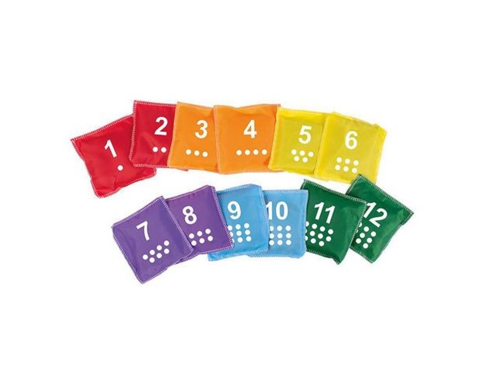 Färgglada ärtpåsar med tryckta siffror och prickar 1-12. Erbjuder många möjligheter för lek och lärande och kan användas både inom- och utomhus. Av nylon, fyllda med plastpellets av polyeten. - Mått 10x10 cm. Varning. Lämpar sig inte för barn under 3 år