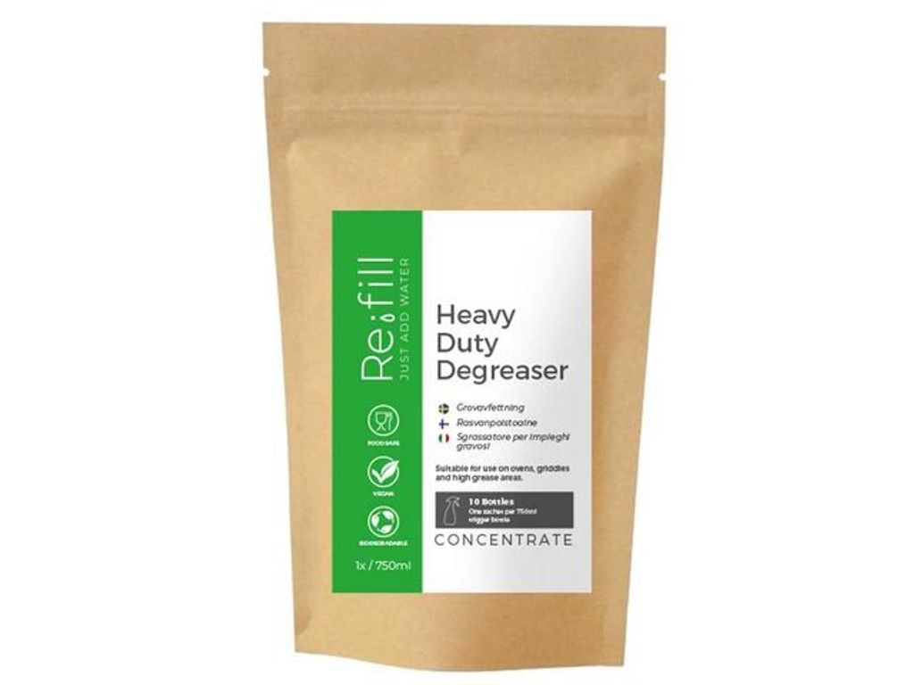 Just add water! Eliminera användningen av engångsplast - tillsätt bara vatten. Rengöringskoncentrat för professionell städning Re:fill Grovavfettning är framtagen för rengöring av spisar, ugnar, fritöser osv. i köksutrymmen. Den passar även för mekanisk industri där smuts, olja och fetter behöver rengöras. Välj ett hållbarare alternativ för en plastfri städning, där du återanvänder flaskan. Minska även transportmängden och spara lagerutrymme. Koncentratet finns i vattenlösliga kapslar. Varje påse innehåller 10 st kapslar. Varje kapsel är exakt doserad för att ge 750ml färdig lösning. 1. Fyll upp flaskan med vatten, 2. Lägg i kapseln, 3. Skaka, 4. Rengör. Samtliga produkter i Re:fill serien framställs av över 90%+ naturliga ingredienser. Tillverkningen sker med hållbarhet i fokus och etiskt utan djurförsök. Certifierad av The Vegan Society. Flaskan på 750ml säljs separat och kommer med en dubbelmunstycke för applicering som spray eller skum. Kom ihåg att spara och återanvända flaskan. - 100% återvinningsbara förpackningar - Eliminerar användningen av engångsplast - pH-värde: xx - Lukt: Parfymerad - Utseende: Tabletter