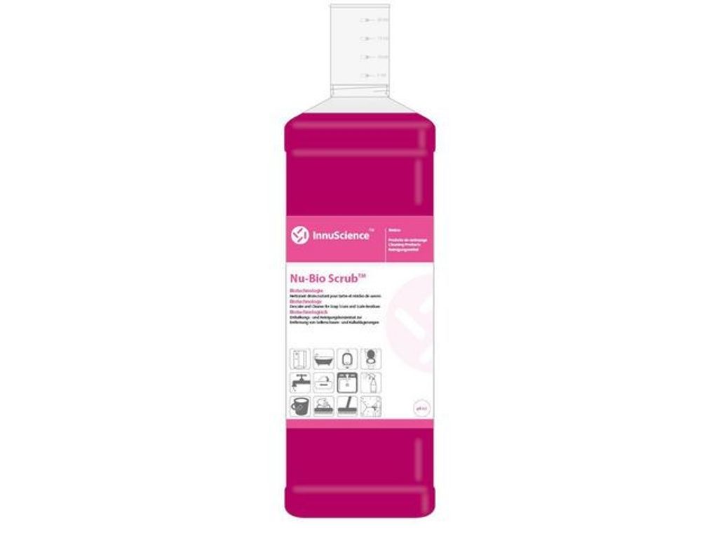 Nu-Bio Scrub är ett koncentrerat biotekniskt rengöringsmedel som rengör ytor och avlägsnar tvål- och kalkrester. Det avlägsnar även dålig lukt och förhindrar blockeringar i rör och avlopp. Nu-Bio ScrubTM Är ett bioteknologiskt surt rengörings- och avkalknngsmedel för alla hårda ytor som tål vatten: dusch, toalett, urinoar, handfat, badkar, kran, krom, rostfritt stål, keramik, drickfontän etc. Koncentrat. - pH- värde: 3,5 - Parfymerad, citron - Dosering:1:15:1:30 - Utseende:Lila