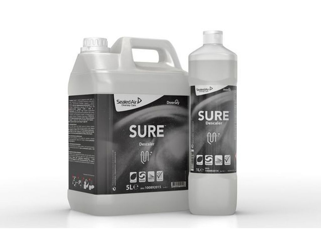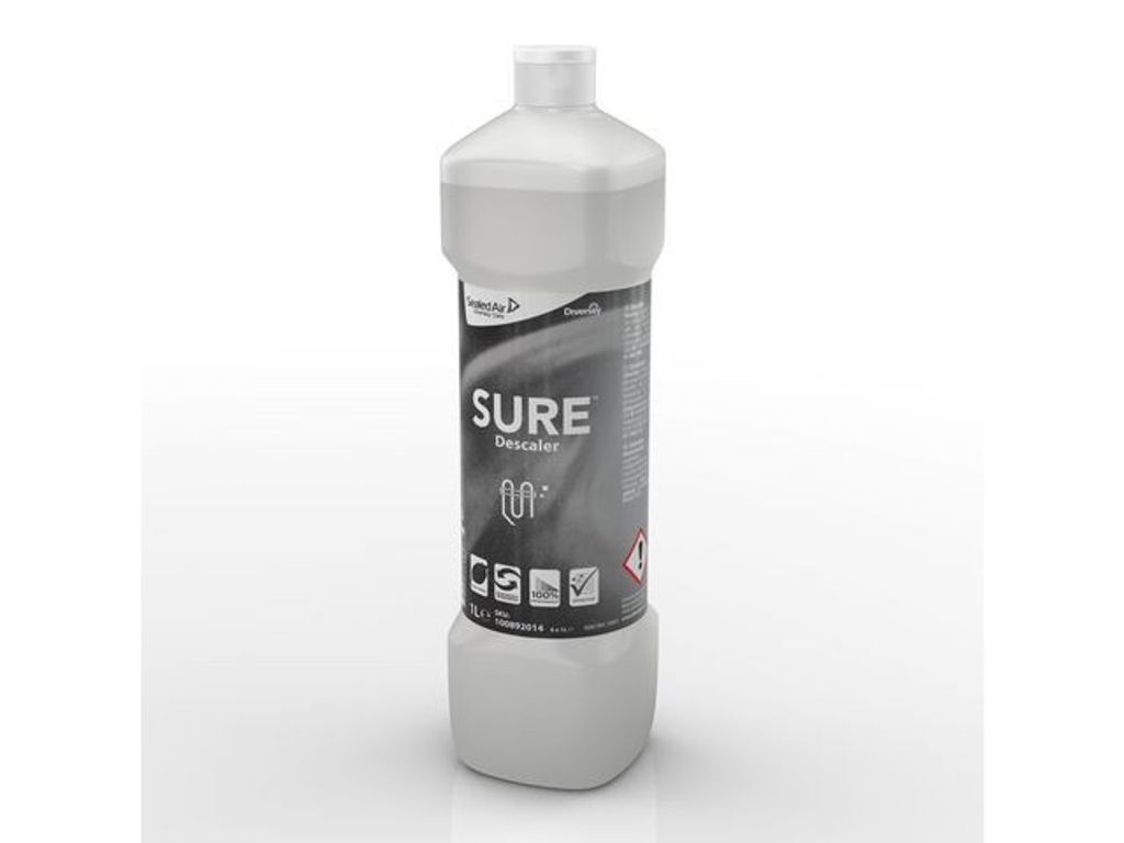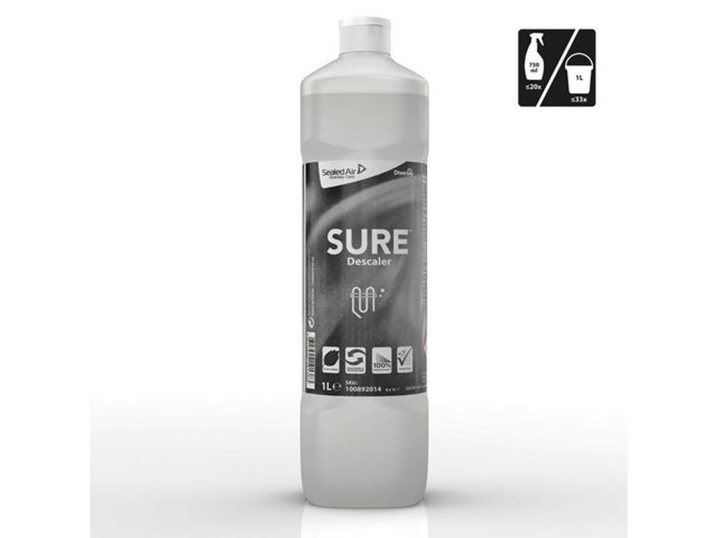 Ett säkert och miljövänligare rengöringsmedel som bryter ner kalkbeläggningar och effektivt rengör olika typer av köksredskap, utrustning och diskmaskiner. SURE Descaler från Diversey är ett miljömedvetet och väldigt effektivt val. Lösningen är växtbaserad, 100 % nedbrytbar och använder förnybara energikällor. Den här koncentrerade avkalkningsvätskan är så effektiv att den enkelt avlägsnar kalkbeläggningar och -avlagringar och tvålrester. Rengöringsmedlet bryter snabbt ned och avlägsnar kalkbeläggningar och förhindrar att de återkommer. Den passar bra att använda på en mängd olika köksredskap, utrustning och även diskmaskiner. SURE-serien erbjuder professionella rengöringsprodukter som är utformade för att uppfylla kraven på effektivitet och tar även hänsyn till miljön och människors hälsa. Alla produkter är vegetabiliska och tillverkade av förnybara energikällor som är 100 % nedbrytbara och utformade för effektivitet. - pH-värde: ca 2 (koncentrat) - Oparfymerad - Dosering: Dosering: - Sprayrengöring: Fyll avsedd 750ml sprayflaska med vatten och dosera 50-200ml SURE Descaler till - flaskan. - Blötläggning: - Dosera 30-50ml SURE Descaler per liter ljummet vatten i en hink eller behållare - (koncentration 3-5%) - Utseende: Färglös till svagt gul vätska