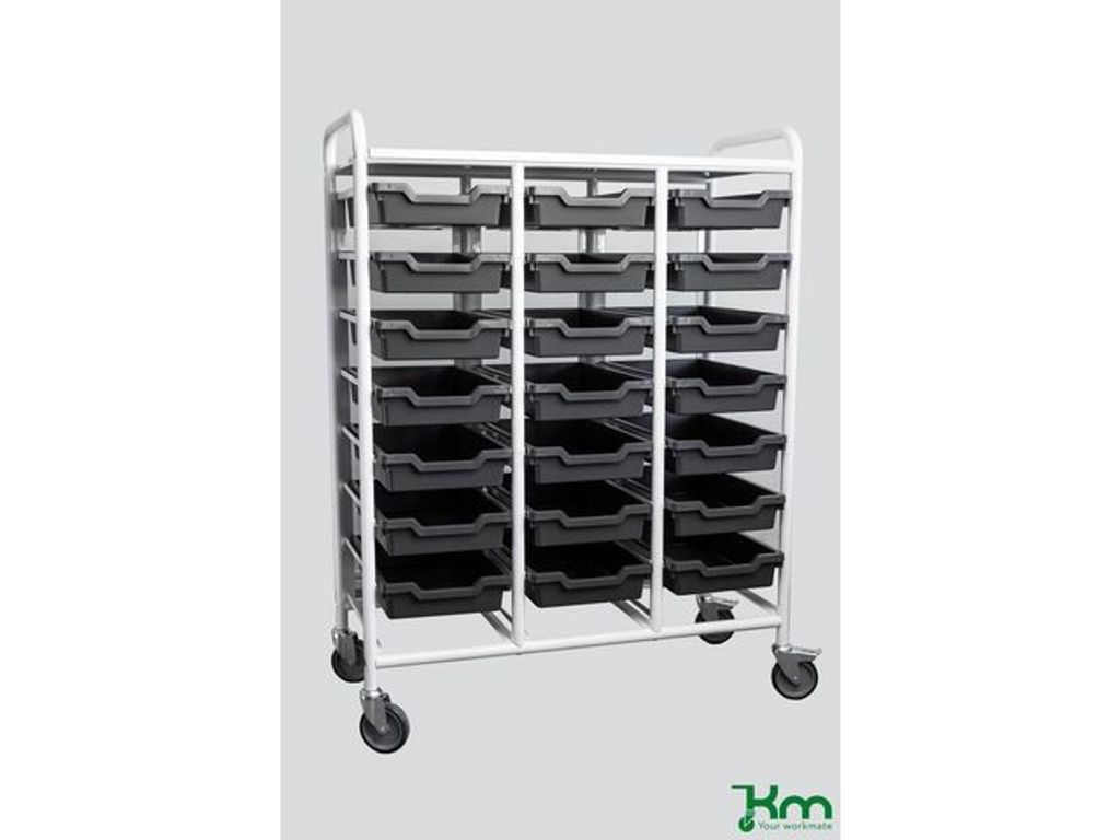 Backvagn med stora förvaringsmöjligheter. Pulverlackerad praktisk vagn med möjlighet till 21 backar med förvaring. Obs! Levereras utan lådor. - Belastning: 150kg - Storlek: 950 x 420 x 1205mm - Färg: Vit - Vikt: 30,5kg - Bromsade hjul: Ja - Hjul: 4st länkhjul varav 2st med broms, 100mm
