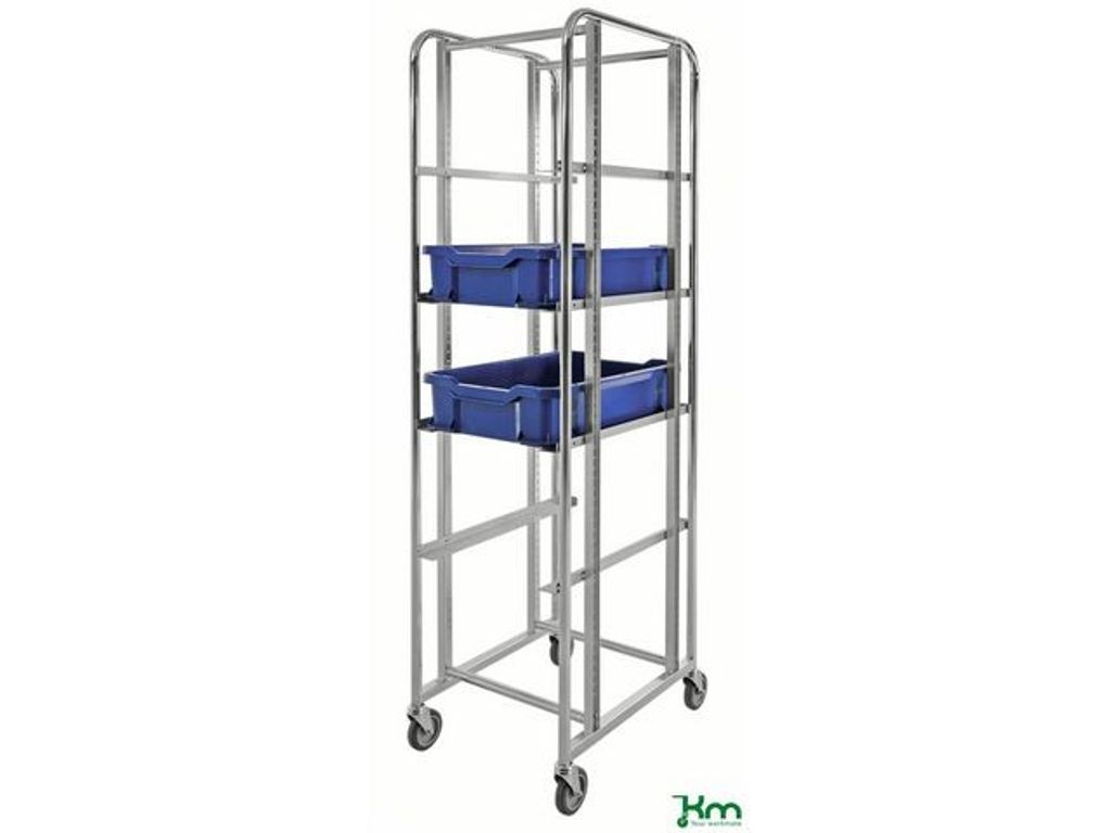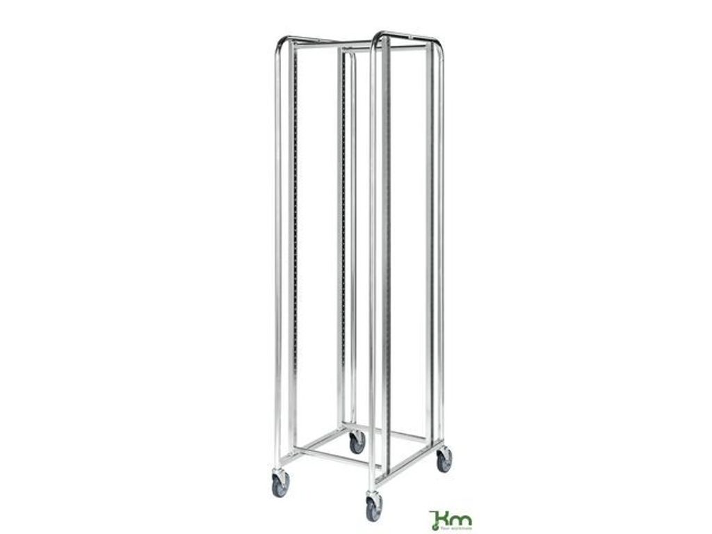Flexibelt backställ som du kan bygga efter eget behov. Välj till gejdrar och hyllplan, dessa kan monteras horisontellt, 16, 30 och 40 grader. Anpassat för Europabackar 600x400mm. Elförzinkad och är tillverkad av 25mm stålrör. Levereras omonterat. - Belastning: 150kg - Storlek: 470 x 585 x 1880mm - Antal hål: 105st - Avstånd mellan hål: 15mm - Färg: Elförzinkad - Vikt: 20kg - Bromsade hjul: Nej - Hjul: 4st länkhjul 100mm