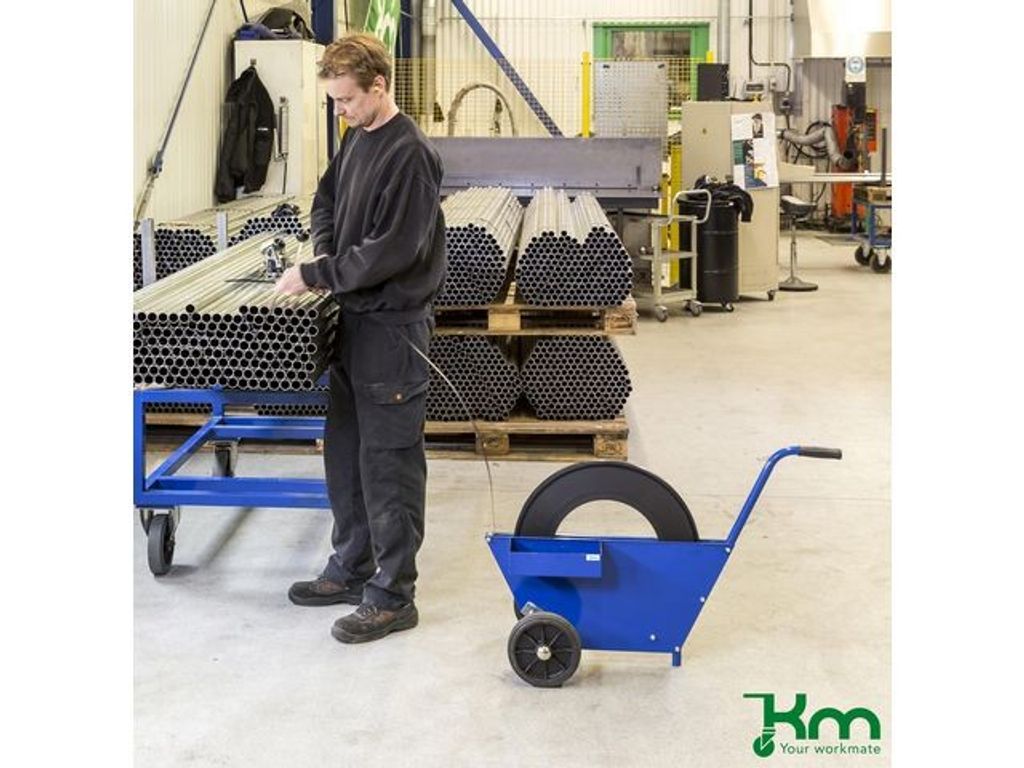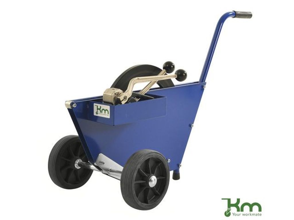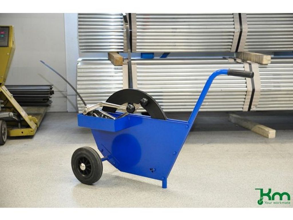 Klassisk bandvagga till stålband, 16-19mm. Med ett praktiskt fack för bandverktyg och ett rymligt fack för verktyg och tillbehör. Passar enkelspolat band från 16 -19 mm bredd. Enkel och snabb skiftning av spole. Solida gummihjul på 200mm. Pulverlackerad. Levereras omonterad. Obs! Bandningsverktyg och stålband ingår inte. - Storlek: 990 x 460 x 640mm (LxBxH) - Färg: Blå - Vagnens vikt: 16kg - Bromsade hjul: Nej - Hjultyp: 2st fasta 200mm gummihjul