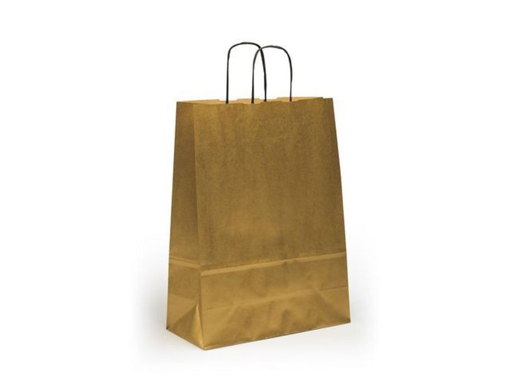 Beskrivning av Bärkasse Medium Guld 150/fp Bärkasse som finns i flera olika färger och storlekar. Fungerar även som presentpåse. Högkvalitativ papperskasse med handtag av tvinnat papper och förstärkt botten. - Mått: 32x14x42cm - Färg: Guld