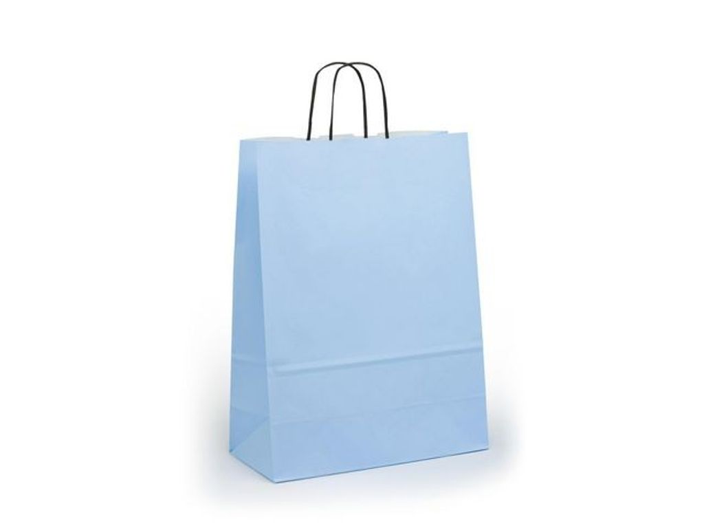 Beskrivning av Bärkasse Medium Ljusblå 150/fp Bärkasse som finns i flera olika färger och storlekar. Fungerar även som presentpåse. Högkvalitativ papperskasse med handtag av tvinnat papper och förstärkt botten. - Mått: 32x14x42cm - Färg: Ljusblå