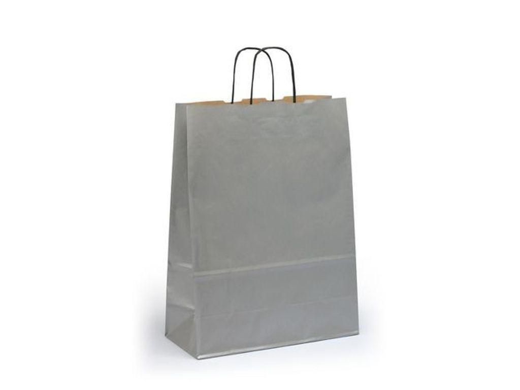 Beskrivning av Bärkasse Medium Silver 150/fp Bärkasse som finns i flera olika färger och storlekar. Fungerar även som presentpåse. Högkvalitativ papperskasse med handtag av tvinnat papper och förstärkt botten. - Mått: 32x14x42cm - Färg: Silver