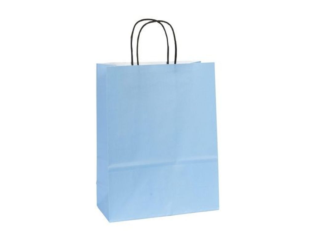 Beskrivning av Bärkasse Small Ljusblå 150/fp Bärkasse som finns i flera olika färger och storlekar. Fungerar även som presentpåse. Högkvalitativ papperskasse med handtag av tvinnat papper och förstärkt botten. - Mått: 24x11x31cm - Färg: Ljusblå