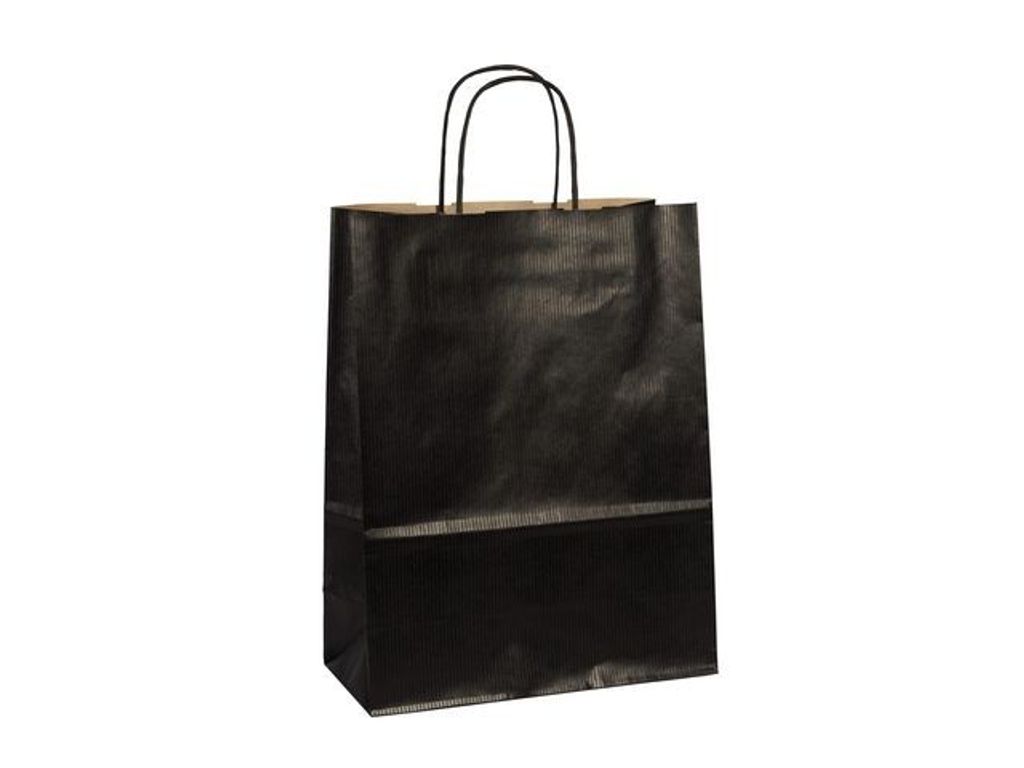 Beskrivning av Bärkasse Small Svart 150/fp Bärkasse som finns i flera olika färger och storlekar. Fungerar även som presentpåse. Högkvalitativ papperskasse med handtag av tvinnat papper och förstärkt botten. - Mått: 24x11x31cm - Färg: Svart