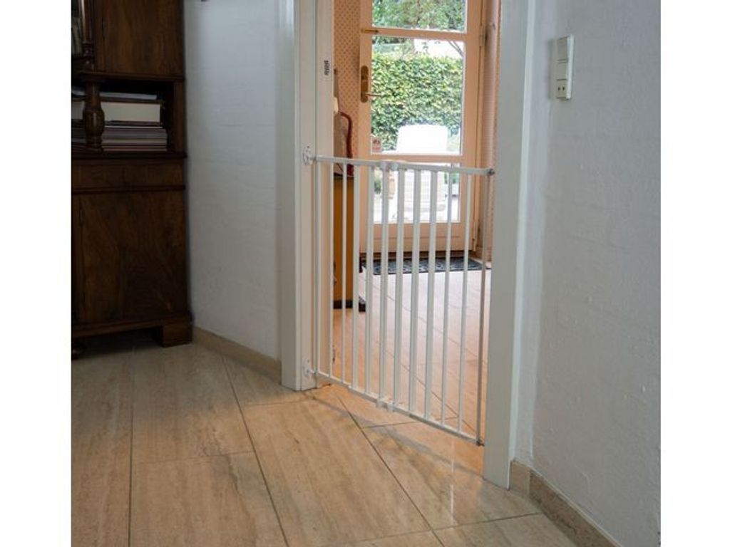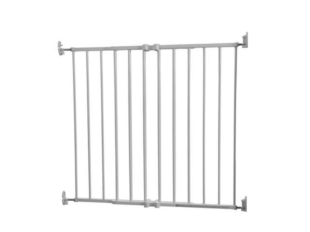 Stadig och flexibel säkerhetsgrind för barn. Skruvmonterad säkerhetsgrind för barn. Detta säkerhetsgaller är användbart i alla starka och oskadade öppningar. Perfekt för användning på trappor. Ingen risk att trippla över gallret. Nätet kan öppnas i öppningens hela bredd och i båda riktningarna. Möjlighet att blockera ett sätt att undvika att öppna över t.ex. trappor. Flexibel montering, vilket möjliggör vinklar i öppningar upp till 180 grader. - Lämplig för öppningar från 64 till 106 cm - Höjd på det monterade gallret: 77 cm - För barn upp till 24 månader - Snabbkoppling - Uppfyller EN 1930: 2011 - Färger: Metall: Vit / Plast: Vit