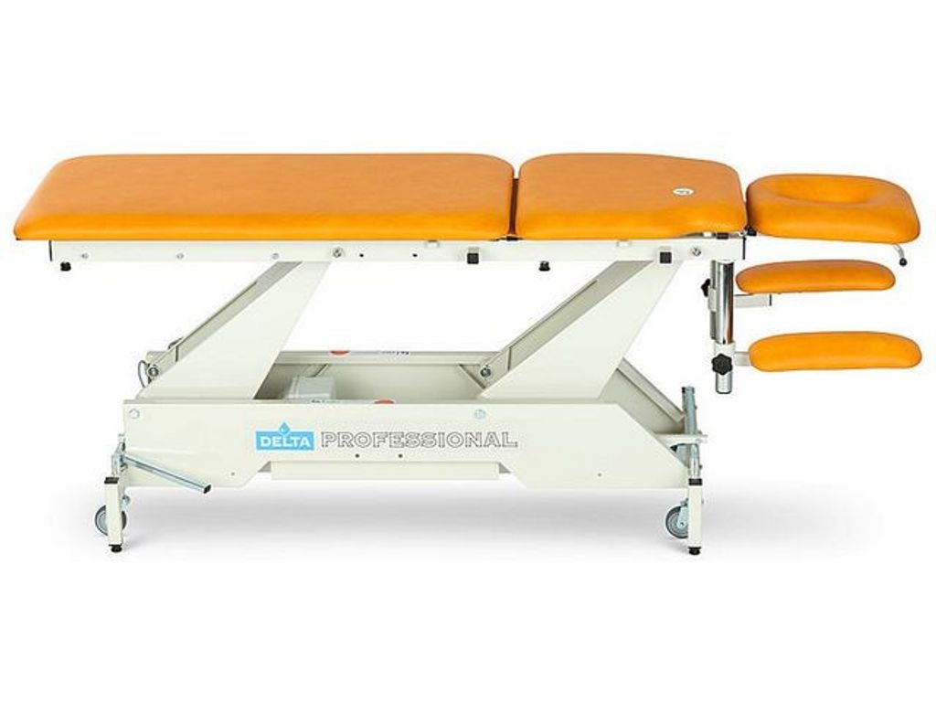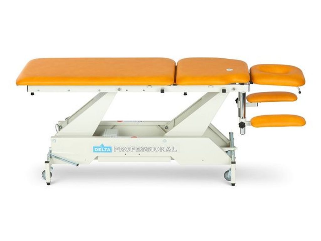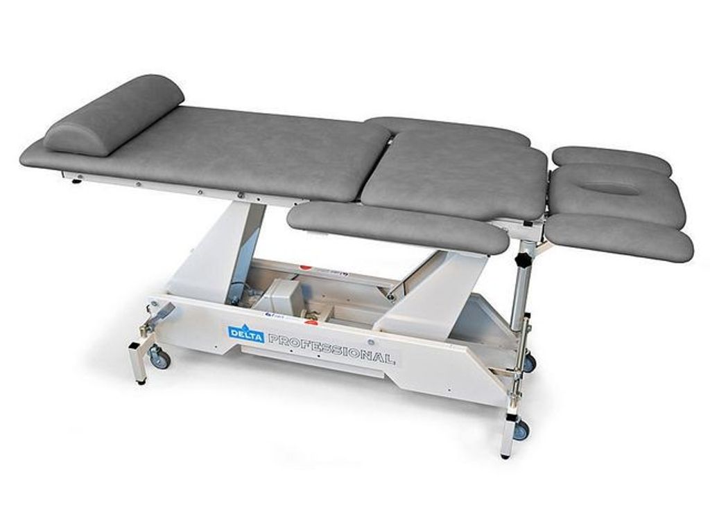 Delta Professional 5-delad behandlingsbänk i stabil konstruktion. Bänken har extra stort höjdomfång och passar perfekt hos sjukgymnaster, naprapater och kiropraktorer. Bänken är 5-delad med delad liggyta, huvuddyna och höj- och sänkbara armstödsdynor. Manuellt dränageläge och fotdynan går att höja till 75 grader. Den är höj- och sänkbar elektriskt med en fotmanöverdosa. Huvuddyna har andnignshål som är steglöst reglerbart med gaskolv. - Bredd: 55 cm - Justerbar höjd: 48-100 cm - Max belastningsvikt: 200 kg - Vikt: 110 kg - Färg: Blå (Ocean) - Garanti: 10 år ram, 2 år motor/hydraulik, 1 år klädsel