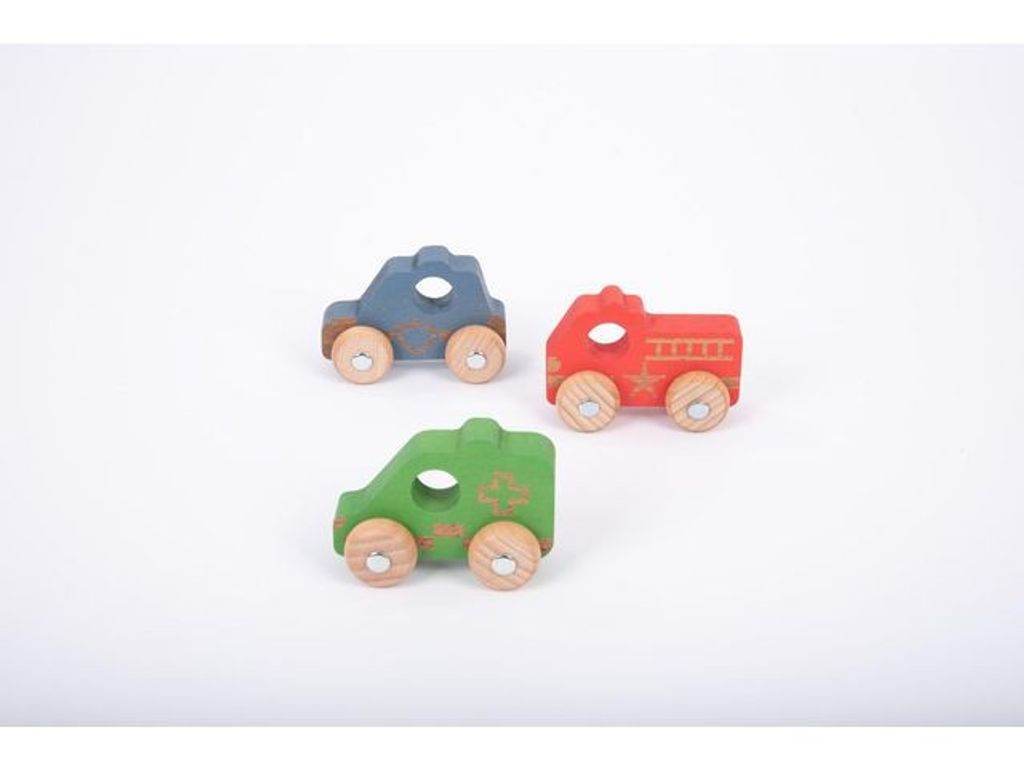 Set med tre stycken olika räddningsbilar i trä. De här fordonen är idealiska för att främja diskussion om arbete och samhällen, de uppmuntrar barnen att använda sig av beskrivande språk i berättandet samt utveckla deras finmotorik när de kör runt med bilarna på marken. Setet innehåller en blå polisbil, en grön ambulans och en röd brandbil. - Mått: brandbil: 9x5,4x4,5 cm - Material: Trä - Lämpliga från 1 år