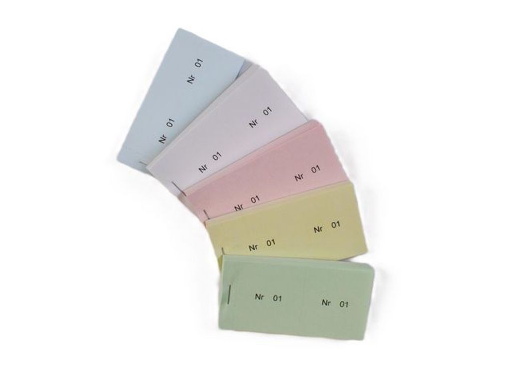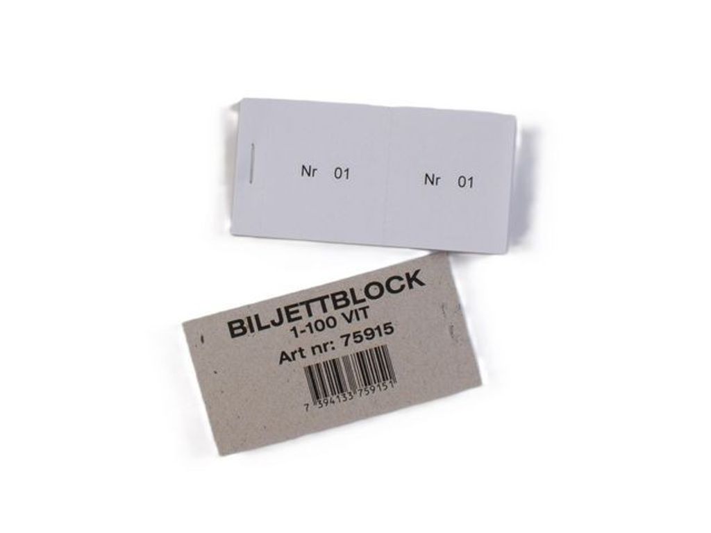 Beskrivning av Biljettblock 1-100 vit Numrerade biljettblock 1-100 med två biljetter per nummer. Biljettblocket är klamrat med två perfar. Texten är tryckt i svart på FSC- och Svanen-miljömärkt 70 grams svenskt papper. Svanen: 30410461 FSC-C128282 - Mått: 100x50mm - Färg: Vit
