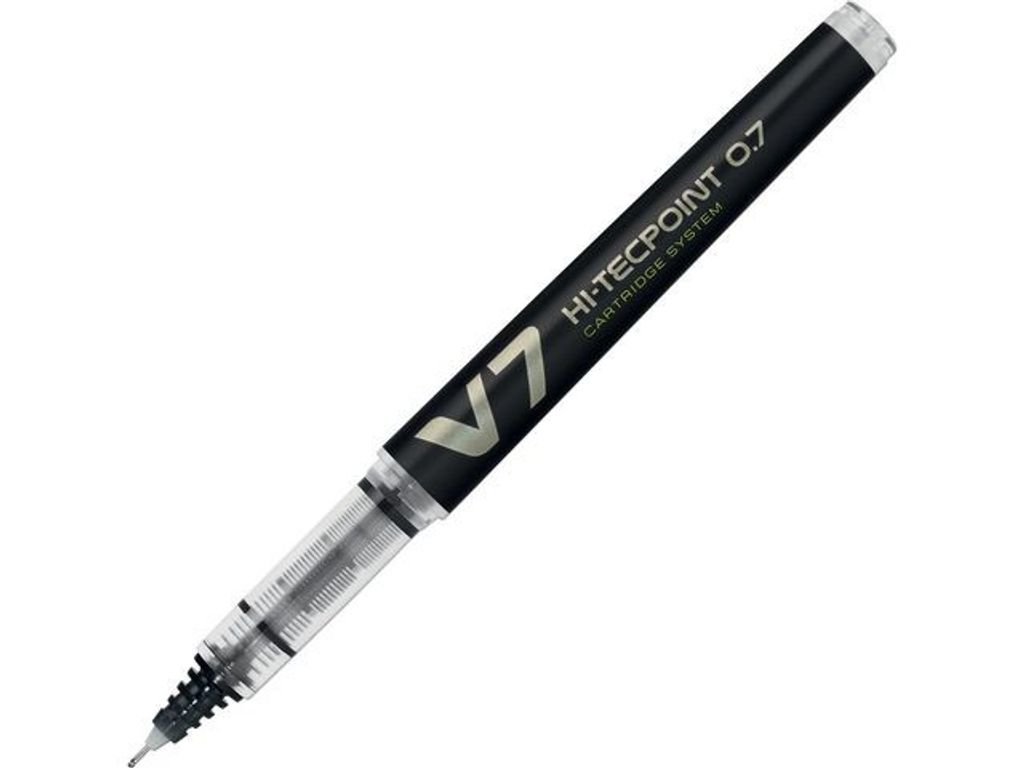 Pilot Begreen Hi-Tecpoint V7 är en tunn rollerballpenna med en bläckregulator som ger ett jämnt bläckflöde. Pilot Begreen Hi-Tecpoint V7 har en nålformad spets i rostfritt stål som ger mjuka penndrag utan ansträngning. Pennan har en tunn spets på 0,7 mm, vilket är perfekt för uppgifter som kräver stor noggrannhet. Dess hållbara kula i hårdmetall, med skåror för extra stöd och stadig vridning, behåller sin form länge. Denna rollerballpenna med flytande bläck har en unik V-systemmekanism som reglerar bläckflödet och ser till att det är jämnt och fast, samt ett litet fönster som visar bläcknivån. Pennan finns i en mängd olika färger och levereras komplett med en kork som skyddar pennan och en fickklämma som gör den praktisk att använda. - Tillverkad av 71 % återvunnet material - Huv - Spetsbredd: 0,7 mm - Textfärg: Svart - Färg pennkropp: Svart - Dokumentäkta bläck enligt ISO 14145