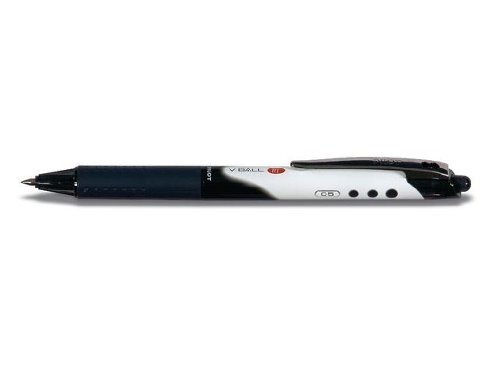 Den tunna rollerballpennan Pilot V-Ball 05 RT har ett unikt flytande bläck med djup färg. Pilot V-Ball 05 RT har flytande bläck och en extra tunn spets på 0,5 mm som gör det smidigt och enkelt att skriva. Rollerballpennan med flytande bläck har en nålformad spets i rostfritt stål som ger mjuka, exakta penndrag utan ansträngning. Pennan är dessutom försedd med ett gummifingergrepp för extra komfort och en stor praktisk fickklämma. Den här rollerballpennan med flytande bläck har en unik V-System-mekanism som reglerar bläckflödet och ser till att det är jämnt och fast. Den här versionen av V-Ball har indragbar spets, vilket ger ökad bekvämlighet. - Klickmekanism - Spetsbredd: 0,5 mm - Textfärg: Svart - Färg pennkropp: Svart - Dokumentäkta bläck enligt ISO 14145