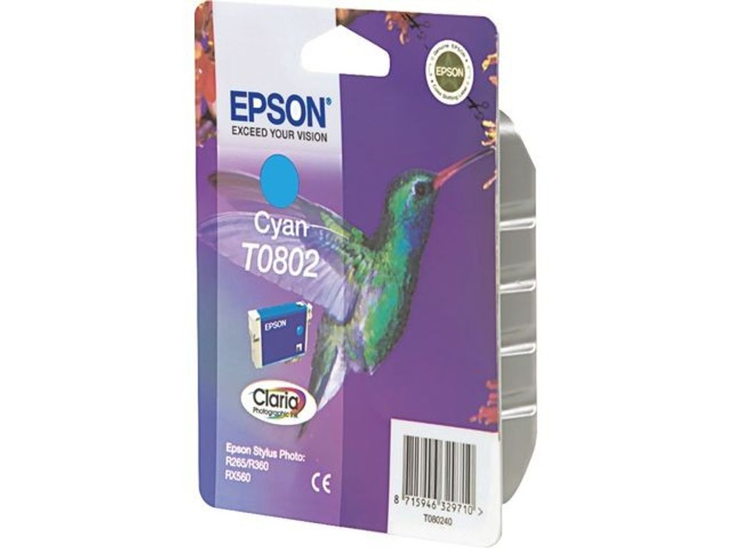 Epson T0802-bläck i cyan är ett ekonomiskt val om du vill ha dokument med djup magenta och foton av labbkvalitet. Epson T0802 cyan bläckpatron med SmartValve-styrning som släpper ut bläcket på ett jämnt sätt skapar utskrifter av hög kvalitet. Den här bläckpatronen är en del av Claria Home Ink-serien som ger utskrifter och foton av hög kvalitet till ett överkomligt pris. Spara pengar genom att ersätta endast den färg som du behöver. Bläcket fungerar bäst i kombination med Epson bläckstråleskrivare för optimala resultat och utskrifter som håller längre. - Färg: Cyan - Kapacitet: Upp till 440 A4-sidor - Kapacitet (liter): 7,4 ml - Epson Claria Home-bläckserien - Dokument med djup svärta och utmärkta fotoutskrifter - Se kompatibilitetstabellen för lämpliga maskiner