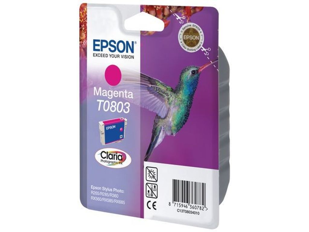 Epson T0803-bläck i magenta är ett ekonomiskt val om du vill ha dokument med djup magenta och foton av labbkvalitet. Epson T0803 magenta bläckpatron med SmartValve-styrning som släpper ut bläcket på ett jämnt sätt skapar konsekvent utskrifter av hög kvalitet. Den här bläckpatronen är en del av Claria Home Ink-serien som ger utskrifter och foton av hög kvalitet till ett överkomligt pris. Spara pengar genom att ersätta endast den färg som du behöver. Bläcket fungerar bäst i kombination med Epson bläckstråleskrivare för optimala resultat och utskrifter som håller längre. - Färg: Magenta - Kapacitet: Upp till 440 A4-sidor - Kapacitet (liter): 7,4 ml - Epson Claria Home-bläckserien - Dokument med djup svärta och utmärkta fotoutskrifter - Se kompatibilitetstabellen för lämpliga maskiner