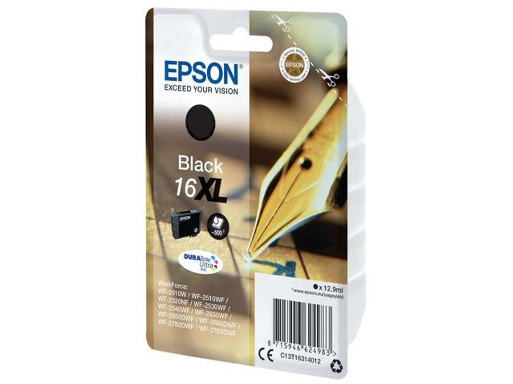 Epson 16XL DURABRite Ultra Svart levererar klara utskrifter, oavsett om det är textdokument eller foton. Epson bläckpatroner är skapade med kvalitet och prestanda i åtanke, Epson 16XL DURABrite Ultra Svart bläckpatron är ekonomisk och enkel att använda. Epson DURABrite Ultra serien är designad för att producera högkvalitativa dokument och livfulla bildutskrifter. Den här bläckpatronen passar bäst tillsammans med Epson-skrivare, tillsammans genererar de utmärkta utskrifter. - Modell: 16XL - Högkvalitativa utskrifter - Kapacitet: 12,9 ml - Kapacitet: Upp till ca 500 sidor vid 5% täckningsgrad - Färg: Svart - Kompatibel med: WF-2010W/WF-2510WF/WF-2520NF/ WF-2530WF/WF-2540WF