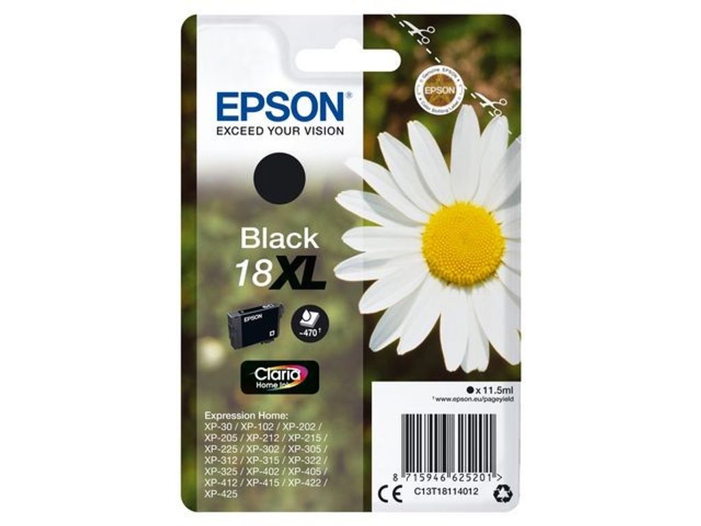 Epson 18XL Svart levererar klara utskrifter, oavsett om det är textdokument eller foton. Epson bläckpatroner är skapade med kvalitet och prestanda i åtanke, Epson 18XL Svart bläckpatron är ekonomisk och enkel att använda. Epson Claria Home Ink serien är designad för att producera högkvalitativa dokument och livfulla bildutskrifter. Den här bläckpatronen passar bäst tillsammans med Epson-skrivare, tillsammans genererar de utmärkta utskrifter. - Modell: 18XL - Högkvalitativa utskrifter - Kapacitet: 11,4 ml - Kapacitet: Upp till 470 sidor - Färg: Svart - Kompatibel med: Expression Home XP-30 / XP-102 / XP-202 / XP-205 / XP-302 / XP-305 / XP-325 / XP-402 / XP-405