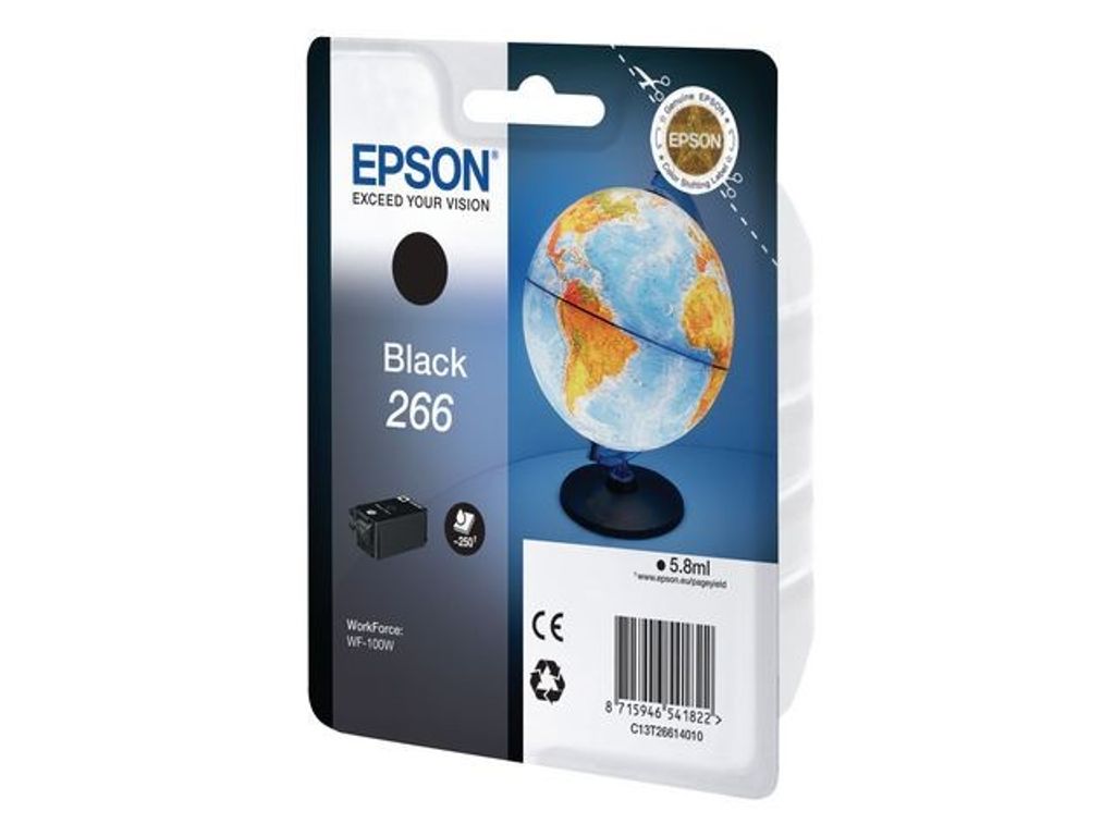 Bläckpatronen Epson Globe 266 innehåller färgbeständigt bläck, vilket bibehålls i utmärkt skick under lång tid. Utför enkelt dina dagliga utskriftsuppgifter och säkerställ högkvalitativa resultat med bläckpatronen Epson Globe 266. Den här bläckpatronen innehåller 5,8 ml svart bläck och har en kapacitet på 250 sidor med 5 % täckning. Bläcket är även hållbart, vilket säkerställer att utskrifterna förblir i utmärkt skick under lång tid. Bläckpatronen är enkel att installera för ökad bekvämlighet och smidighet. - Färg: svart - Kapacitet på 250 sidor - Sidkapacitetstäckning: 5 % - Singelförpackning - Färgbeständigt och hållbart - Fantastiskt för mindre förvaring hemma eller på kontoret - Enkel att installera - Volym: 5,8 ml