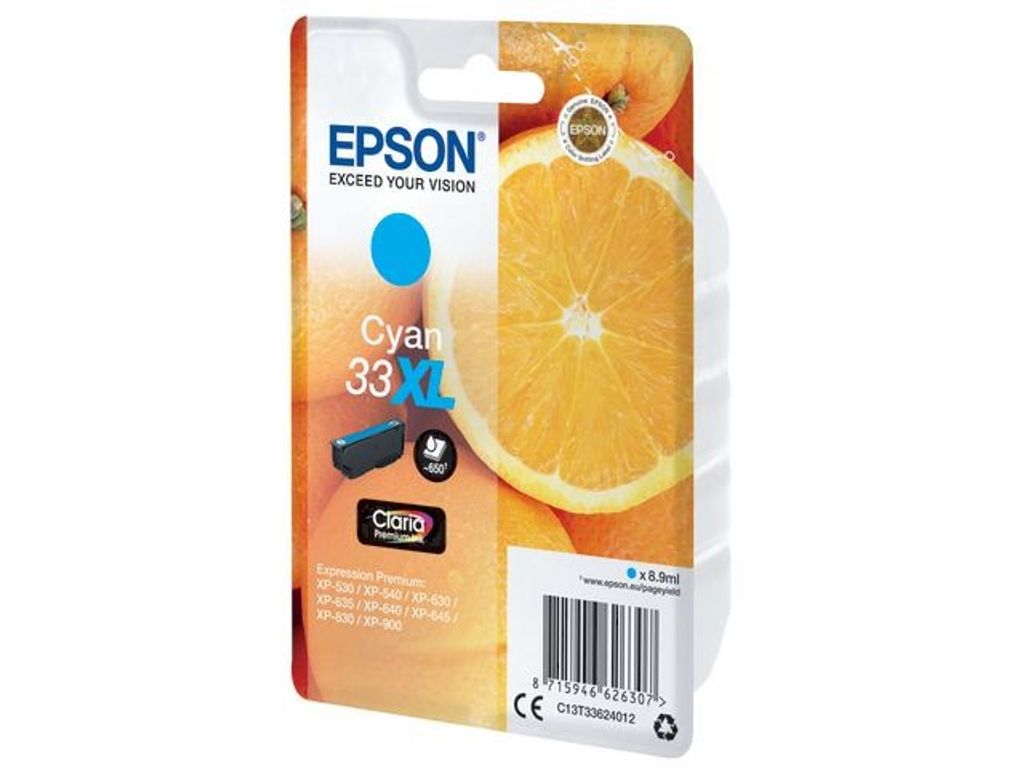 Epson 33XL Claria Premium-bläck i cyan ger skarpa, tydliga dokument och blanka fotoutskrifter. Epson Orange 33XL Claria Premium-bläckpatron i cyan är prisvärd, enkel att använda och tillverkad med kvalitet och prestanda i åtanke. Bläcket i Epson Claria Premium-serien har utformats för att framställa högkvalitativa, kladdfria dokument och utskrifter av fotokvalitet med klara färger. Det här bläcket fungerar bäst i kombination med Epson-skrivare och ger enastående utskrifter som håller längre. En patron i cyan skriver ut upp till 650 A4-sidor. - Dokument med djup svärta och högkvalitativa fotoutskrifter - Kapacitet: 8,9 ml - Sidkapacitet: upp till 650 sidor - Färg: cyan - Se kompatibilitetstabellen för lämpliga maskiner