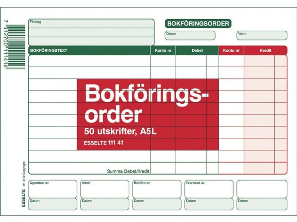 Beskrivning av Blankett bokföringsorder A5L 50 blad Svensktillverkade blanketter - Esselte A5L bokföringsorder med Svanen I block utan kopia. A5L, 50 blad. - - Svanen: Licensnummer: 441675