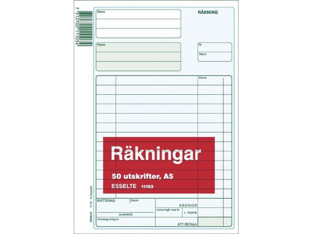 Beskrivning av Blankett räkning utan kopia A5 50 blad Kantlimmade och hålade, med momskolumn. A5, 50 blad.
