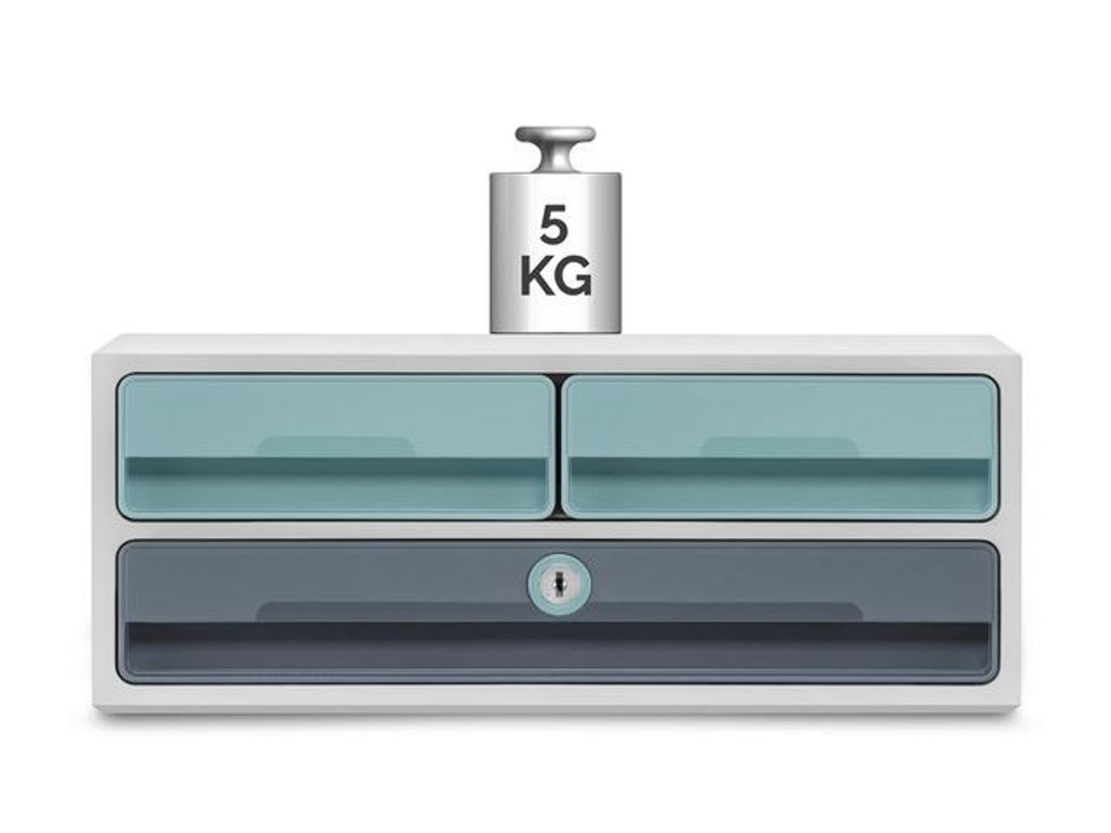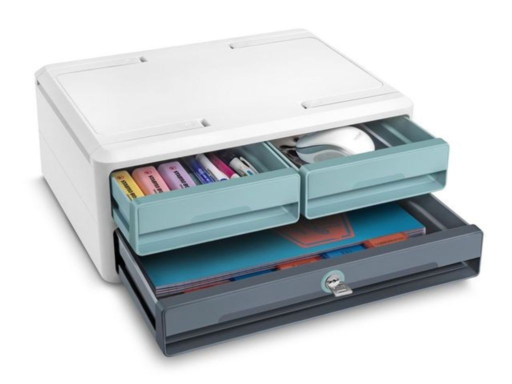 Robust lådmodul för kontoret och hemkontoret. Passar som bildskärmsställ eller laptop-booster för bättre ergonomi och hemmakontor. Multifunktionellt lådsystem som kan användas både för förvaring och som ett robust bildskärmsställ för din datorskärm (upp till 5 kg). Lådsystemet är dessutom försett med praktiska handtag så att det går lätt att transportera. Lådsystemet har tre lådor som alla kan låsas med 1 nyckel, två mindre för t.ex. skrivredskap och en stor med plats för dokument, gummibandsmappar, surfplattor och bärbara datorer upp till 14'. Det är tillverkat av plast och har måtten 14,6 x 36,9 x 27,5 cm (HxBxD). - Robust bildskärmsställ - Lådsystemet har tre lådor som alla kan låsas