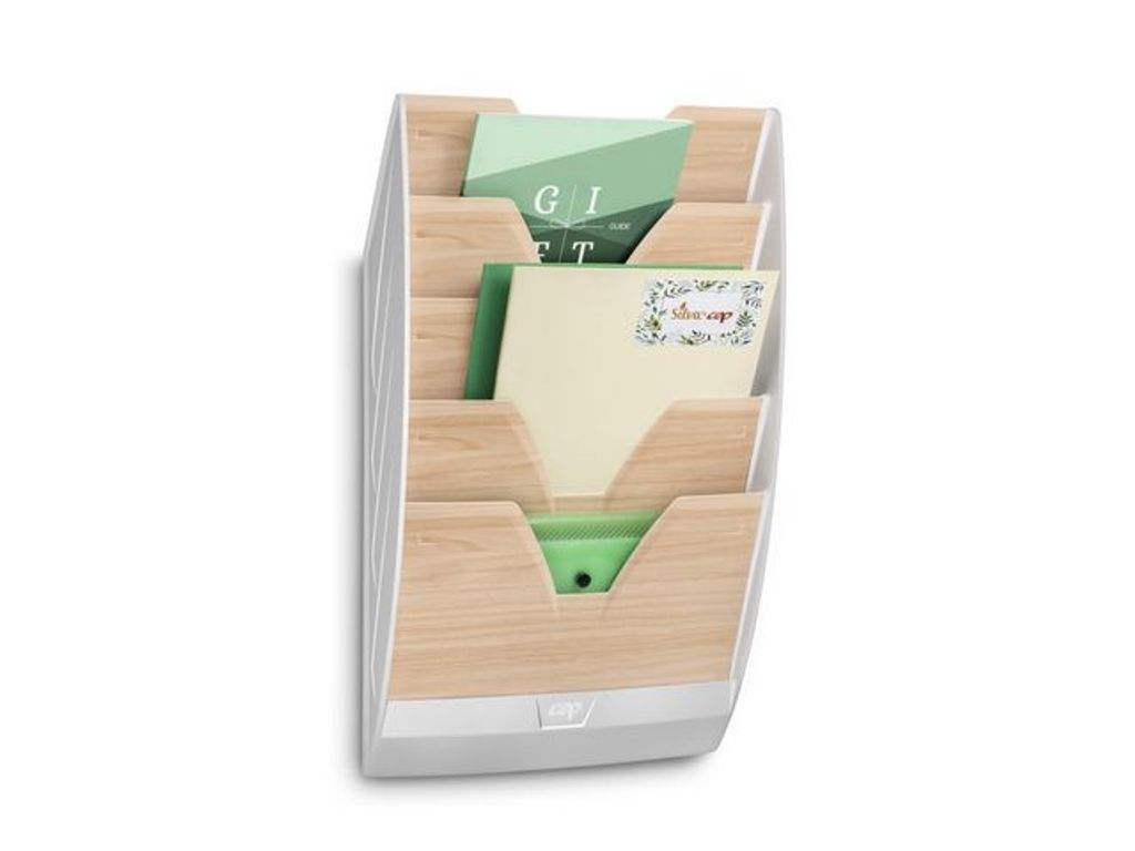 Stilren väggdisplay tillverkad som en robust, solid del med 5 fack och en snygg trämönstrad design. Den naturliga designen ger en mjuk och varm känsla på klassiskt Skandinavisk sätt. Facken är v-formade och djupa för att lätt få plats med och nå både stora och små dokument. Det översta facket har en lutning för säker förvaring av ihoprullade dokument av större storlek. Har en kapacitet för större och tjockare dokument på upp till 24x32cm, som kan förvaras både vertikalt eller horisontellt. Detta starka väggställ kan hålla tunga dokument med sin kapacitet på upp till 7kg. - Förvaringsutrymme i 1 fack: 325x24mm - Väggmonteringssats ingår