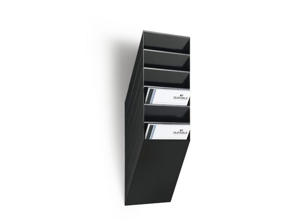 Organisera mappar, tidskrifter eller dokument i snygg väggdisplay. Montera denna Durable Flexiboxx väggdisplay på en vägg för snabb organisering av dokument, tidskrifter eller andra A4-papper. Skapa ett utrymme för visning av tidskrifter eller ett snabbt arkiveringssystem för A4-dokument med denna väggdisplay från Durable Flexiboxx. Med sex fack ger den här vertikala displayen snabb ordning på kontor och i väntrum, samtidigt som designen är enkel att installera. Installera den här Flexiboxx-väggdisplayen på några minuter i alla rum som har användning för extra arkivering eller tidskriftsförvaring. - Organisera pärmar, tidskrifter eller dokument - 6 separata fack för organisation - Alla undersektioner mäter 23 mm - Färg: Svart - Väggdisplay med måtten (BxHxD) 240 x 690 x 135 mm
