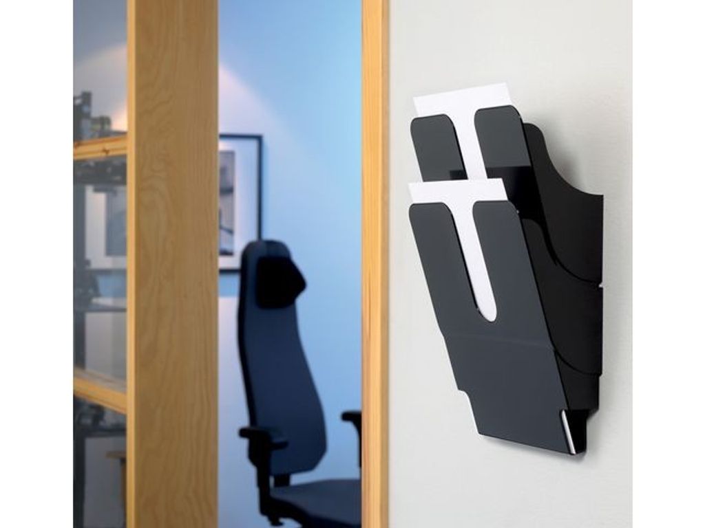 Broschyrstället Durable Flexiplus har två rymliga fack som rymmer tidskrifter, broschyrer och tidningar, och hängs upp för att spara golvyta. Praktiska fack som rymmer broschyrer, tidningar eller blanketter i A4 stående format upp till 23mm tjocka buntar . Bygg ut efter behov genom att haka i facken efter varandra. Går även att använda som singelfack. Facken skruvas upp på väggen, skruv medföljer. Mått ihopmonterat 2-fack (HxBxD): 360x250x100mm - Antal fack: 2 - Fackens djup: Cirka 23 mm - Format: A4 - Färg: Svart - Mått: 360x250x100mm - Material: Polystyren (PS)