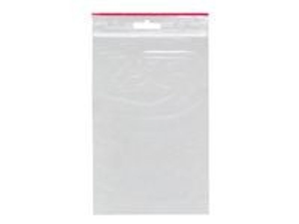 Blixtlåspåse tillverkad av LDPE med eurohål för upphängning. Blixtlåspåse T-20, 120x180mm (innermått). 50 micron, kraftig blixtlåsförslutning och röd linjemarkering. 100 påsar per bunt, 1000 påsar per förpackning. - Antal: 1000/fp - Innermått: 120x180mm