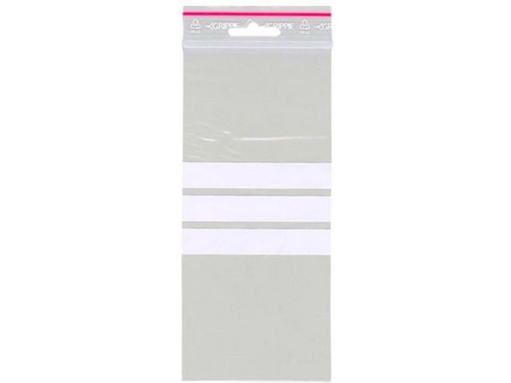 Blixtlåspåse tillverkad av LDPE med 5mm eurohål för upphängning och tre vita skrivfält. Med kraftig blixtlåsförslutning och röd linjemarkering. Livsmedelsgodkända. 100 påsar per bunt, 1000 påsar per förpackning. - Storlek: 100x150mm (innermått) - Modell: T-64 - Tjocklek: 50 mikron - Hålning: Eurohål