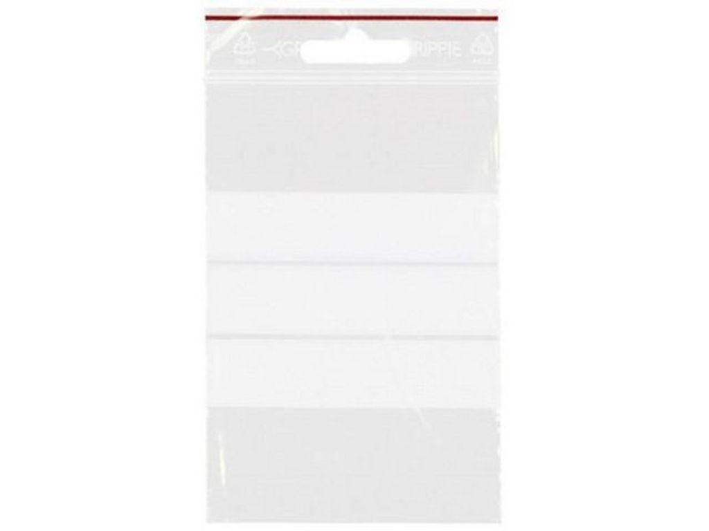 Blixtlåspåse tillverkad av LDPE med 5mm eurohål för upphängning och tre vita skrivfält. Med kraftig blixtlåsförslutning och röd linjemarkering. Livsmedelsgodkända. 100 påsar per bunt, 1000 påsar per förpackning. - Storlek: 80x120mm (innermått) - Modell: T-65 - Tjocklek: 50 mikron - Hålning: Eurohål