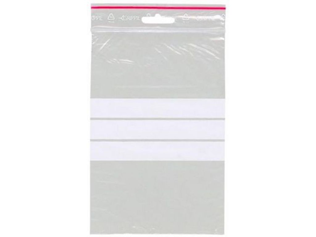 Blixtlåspåse tillverkad av LDPE med 5mm eurohål för upphängning och tre vita skrivfält. Med kraftig blixtlåsförslutning och röd linjemarkering. Livsmedelsgodkända. 100 påsar per bunt, 1000 påsar per förpackning. - Storlek: 120x180mm (innermått) - Modell: T-68 - Tjocklek: 50 mikron - Hålning: Eurohål