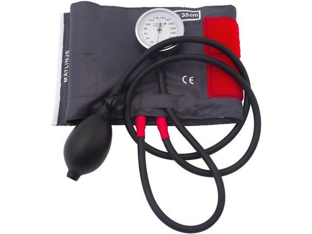 Blodtrycksmätare 2-slang, komplett med manometer vid manschetten och bollpump med tryckventil. Manschetten har tydliga markeringar för kontroll så att rätt storlek används. Hela blodtrycksmätaren är latexfri. Separat tvättbar yttermanschett och blåsa.