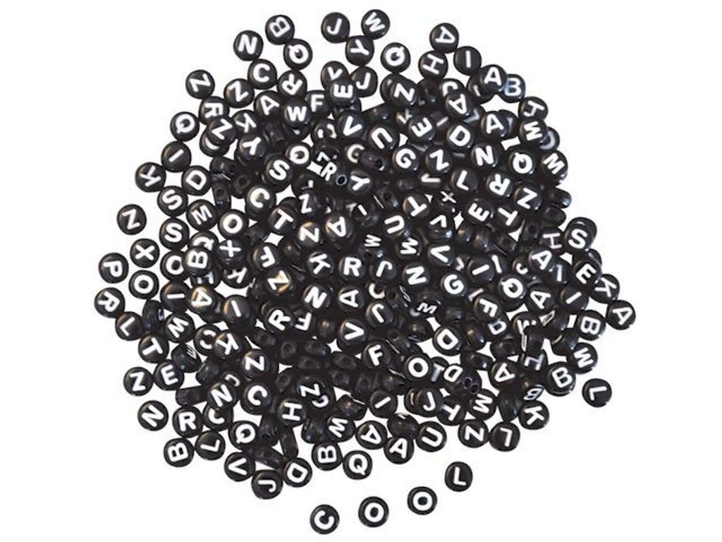Bokstavspärlor, runda, svarta med bokstäver i vitt. Låt fantasin flöda och skapa egna coola armband och halsband som dessutom kan bli en kul present. Perfekt pyssel för barn som lär sig skriva och läsa samtidigt som de har roligt. Påsen innehåller bokstäver från A-Z. - Antal: Ca 500/FP - Mått: Ø 7,5 mm - Material: PS