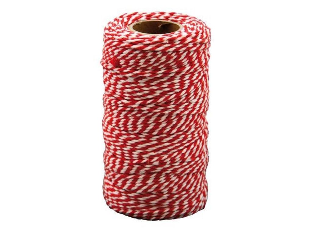 Röd-och vitrandigt bomullssnöre på rulle. Användbart till mycket exempelvis presentinslagning, pyssel, upphängning av julkulor, pepparkakor eller girlanger. - Längd: 100m - Ø: 2mm - Färg: röd och vit - Material: 100% bomull