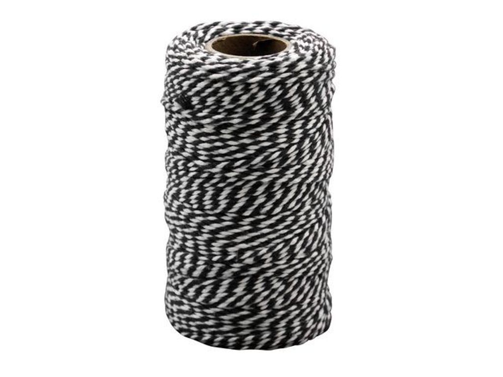 Svart- och vitrandigt bomullssnöre på rulle. Användbart till mycket, exempelvis presentinslagning, pyssel, upphängning för julkulor, pepparkakor eller girlanger. - Längd: 100 m - Ø: 2 mm - Färg: Svart och vit - Material: 100% bomull