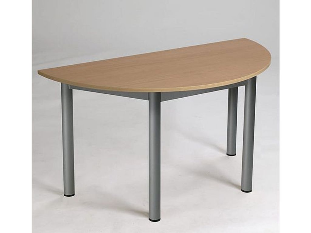 Halvrunt skolbord med bordsskiva av bokmelamin. Pulverlackerad stålram med runda ben.