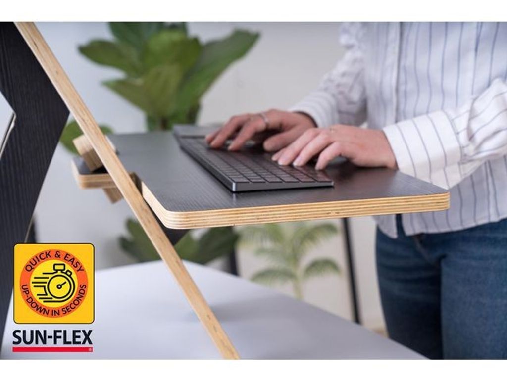 SUN-FLEX Easydesk Rise gör arbetsdagen enklare, friskare och bekvämare, vare sig du jobbar hemma, på kontoret eller varsomhelst. Med SUN-FLEX UP-DOWN-IN-SECONDS-system skapar du en komplett ergonomisk arbetsplats snabbt. SUN-FLEX®EASYDESK RISE är ett stativ som gör vilken platt yta som helst, till det perfekta arbetsbordet och med 10 olika individuellt justerbara höjdlägen, ger det den rätta arbetshöjden, var du än står. Du sätter upp stativet på några sekunder, och plockar ihop det minst lika snabbt, och tar då liten plats. Med två avlastningsytor, varav en är stor nog för att få plats med både externt tangentbord, mus och t ex anteckningspapper, och med hängkrokar för iPad och eller telefon, får du en komplett arbetsstation i ett paket. Alla delar ingår. Med gediget material, stabil konstruktion med låsanordning, tål SUN-FLEX®EASYDESK RISE hög belastning utan att det ger avkall på vare sig stabilitet eller säkerhet. Stativet finns i två utföranden: Natural Black (svart) eller Natural White (vit). Komplett produktlösning med två avlastningsytor och krokar för iPad- och eller telefon. - Belastning: Upp till 70 kg - Säkerhetslås: Ja - Justerbar: Ja, 10 olika höjder - Material: 18 mm laminerad plywood - Stomme: Höjd: 755 mm Bredd: 360 mm (bredaste mått) - Avlastningsyta 1 (lämpligt för externt tangentbord mus etc.): Bredd: 700 mm Djup: 300 mm - Avlastningsyta 2 (lämpligt för laptop, extern skärm etc.): Bredd: 350 mm Djup: 230 mm - Garanti: 2 år - Förpackning: Styck - Vikt: 9,5 kg - Färg: Svart