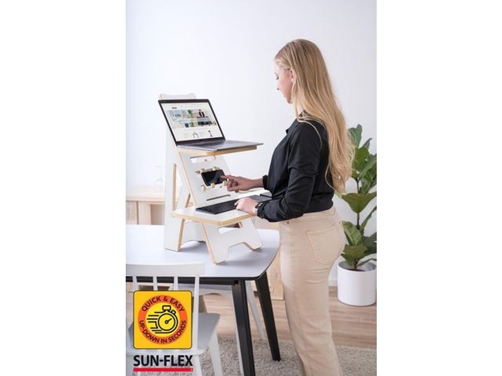 SUN-FLEX Easydesk Rise gör arbetsdagen enklare, friskare och bekvämare, vare sig du jobbar hemma, på kontoret eller varsomhelst. Med SUN-FLEX UP-DOWN-IN-SECONDS-system skapar du en komplett ergonomisk arbetsplats snabbt. SUN-FLEX®EASYDESK RISE är ett stativ som gör vilken platt yta som helst, till det perfekta arbetsbordet och med 10 olika individuellt justerbara höjdlägen, ger det den rätta arbetshöjden, var du än står. Du sätter upp stativet på några sekunder, och plockar ihop det minst lika snabbt, och tar då liten plats. Med två avlastningsytor, varav en är stor nog för att få plats med både externt tangentbord, mus och t ex anteckningspapper, och med hängkrokar för iPad och eller telefon, får du en komplett arbetsstation i ett paket. Alla delar ingår. Med gediget material, stabil konstruktion med låsanordning, tål SUN-FLEX®EASYDESK RISE hög belastning utan att det ger avkall på vare sig stabilitet eller säkerhet. Stativet finns i två utföranden: Natural Black (svart) eller Natural White (vit). Komplett produktlösning med två avlastningsytor och krokar för iPad- och eller telefon. - Belastning: Upp till 70 kg - Säkerhetslås: Ja - Justerbar: Ja, 10 olika höjder - Material: 18 mm laminerad plywood - Stomme: Höjd: 755 mm Bredd: 360 mm (bredaste mått) - Avlastningsyta 1 (lämpligt för externt tangentbord mus etc.): Bredd: 700 mm Djup: 300 mm - Avlastningsyta 2 (lämpligt för laptop, extern skärm etc.): Bredd: 350 mm Djup: 230 mm - Garanti: 2 år - Förpackning: Styck - Vikt: 9,5 kg - Färg: Vit