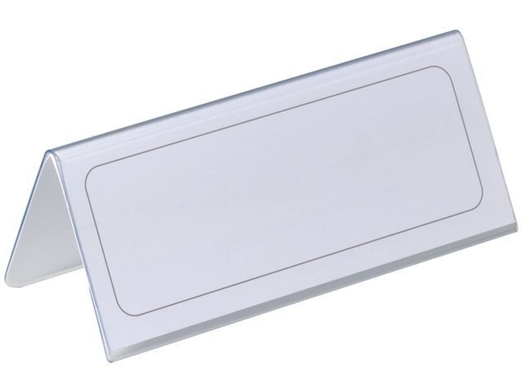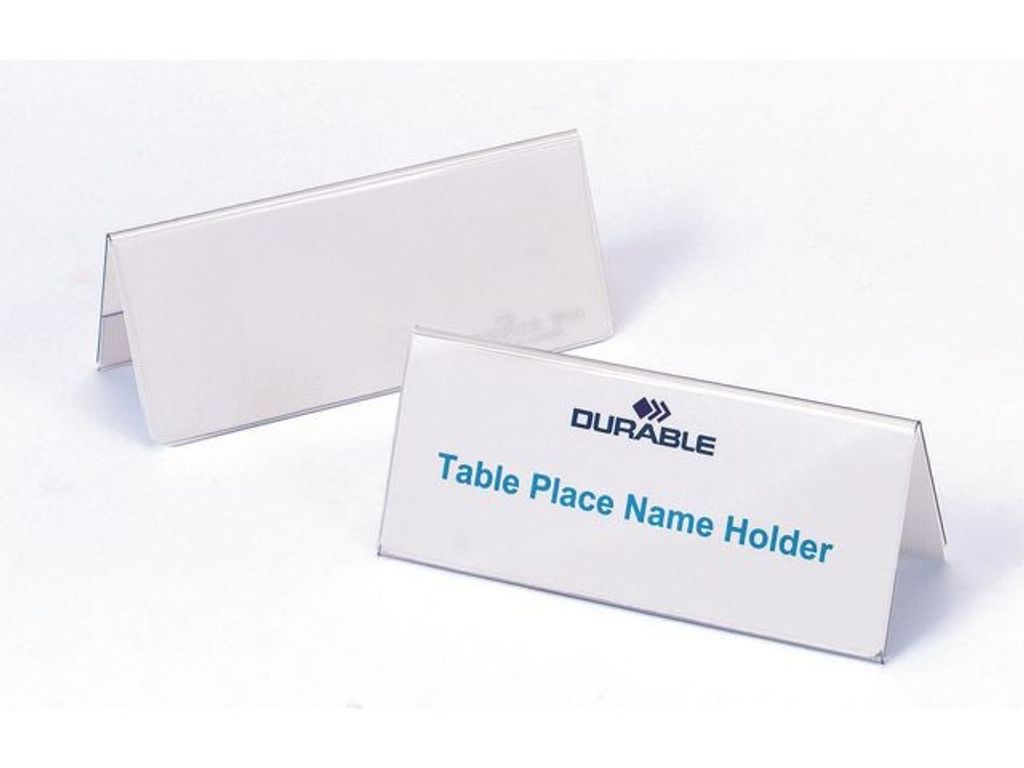 Skapa tillfälliga eller permanenta namnskyltar eller prisskyltar med de här namnskyltarna från Durable. Paketet innehåller 25 skyltar. Anordna en konferens eller visa namn på skrivbord med de här namnskyltarna från Durable. Den vinklade utformningen gör namnet lätt att se från båda sidor. Den hårda PVC-plasten tål daglig användning. Skriv eller tryck information på den medföljande etiketten. Det här paketet innehåller 25 namnskyltar från Durable. Använd för mötesdeltagare eller på vanliga arbetsstationer. Tillverkad av PVC. - Tydlig namnvisning för deltagare eller anställda - Hård PVC-plast som inte spricker - Etiketter medföljer - Färg: Genomskinlig - Innehåller 25 etiketter - Mått: 61/122 x 150 mm
